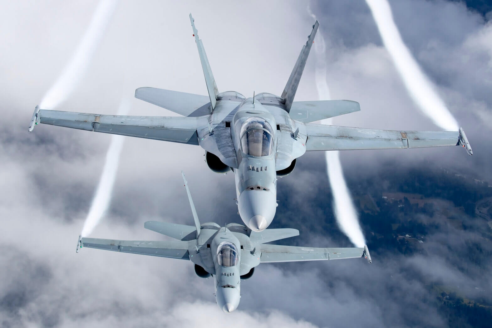 Air to air with two RCAF CF-188 Hornets during the 2023 Abbotsford International Airshow. Photo by Aviation PhotoCrew
