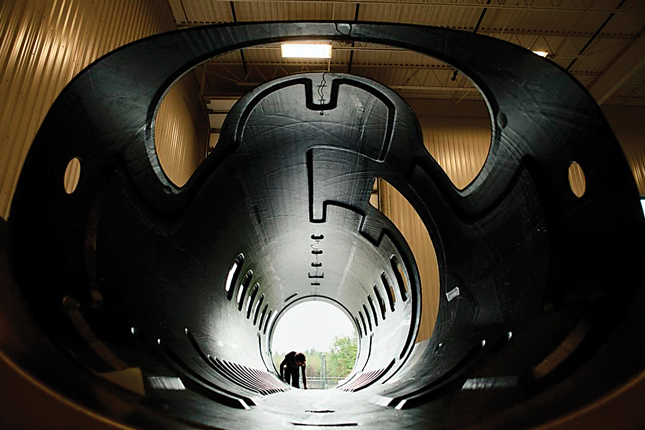 To build the Learjet 85’s composite fuselage and wing and tail components, engineers at Bombardier’s Belfast facility developed resin transfer infusion (RTI) technology, a hybrid of resin transfer moulding and autoclave processing. Sheets of dry carbon fibre are cut to the desired shape by an ultrasonic cutter and laid on a mould-line tool; an inflatable bag forms the other side of the mould. During the 2011 Paris Airshow, Colin Elliott, Bombardier Aerospace’s vice president of engineering, business and product development, commented: “The clever stuff is how you vacuum bag it and keep the pressure on. We call it a flexible mould-line tool.”