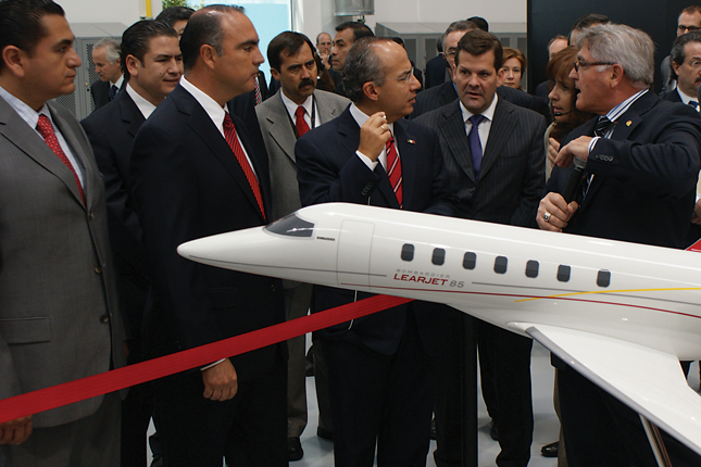 In the meantime, work on the Learjet 85 continues at Bombardier’s Mexico plant in the Queretaro Aerospace Park, which was officially opened on Oct. 21, 2010. Mexican president Felipe Calderon and Jose Calzada, governor of the State of Queretaro, were among the dignitaries present at the opening. A Bombardier press release said: “The construction of the 185,000 sq. ft. (17,187 sq. m.) Learjet 85 aircraft component manufacturing centre was completed in July 2010. The fabrication of development parts soon followed, and the fabrication of parts for the first aircraft is now underway. In addition, over 36,300 sq. ft. (3,372 sq. m.) of existing space at the Queretaro site has been allocated to the Learjet 85 aircraft program. This brings the total Learjet 85 aircraft footprint at the Queretaro manufacturing site to approximately 221,300 sq. ft. (20,560 sq. m.) in order to support composite fuselage manufacturing and wing assembly.”