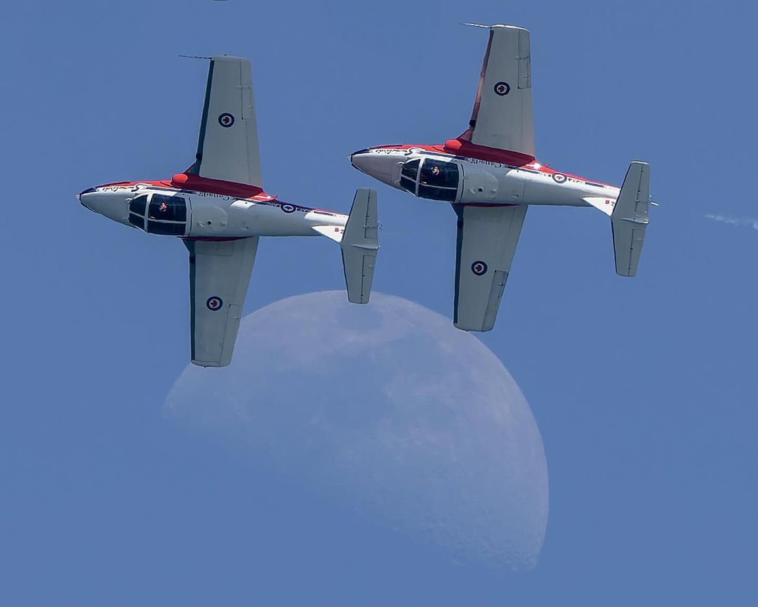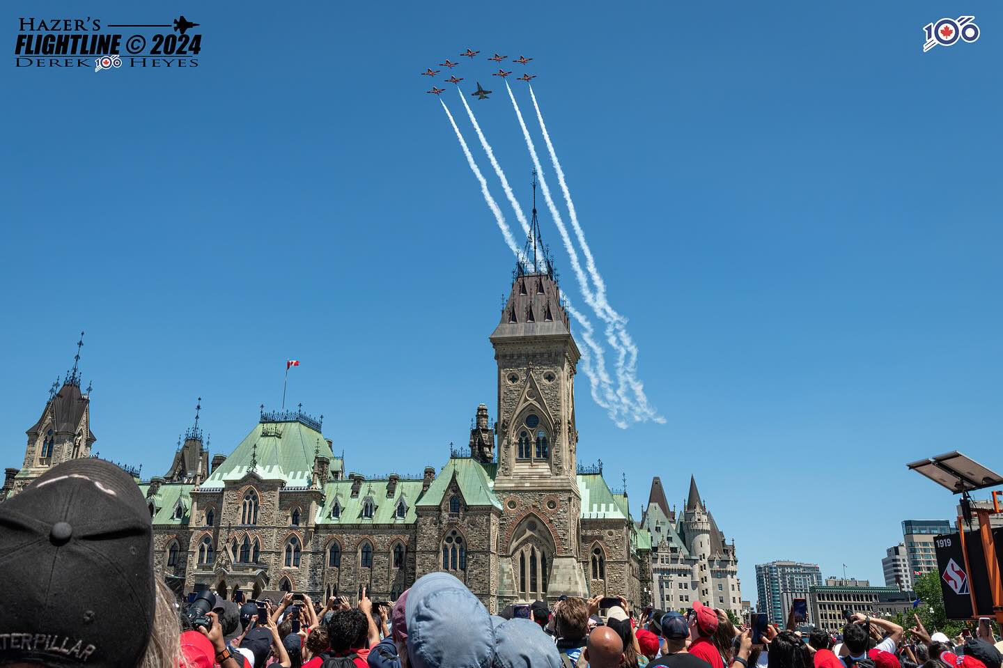 The CF Snowbirds and CF-18 Demo jet perform a flypast over Parliament Hill in Ottawa on Canada Day 2024. Derek Heyes Photo
