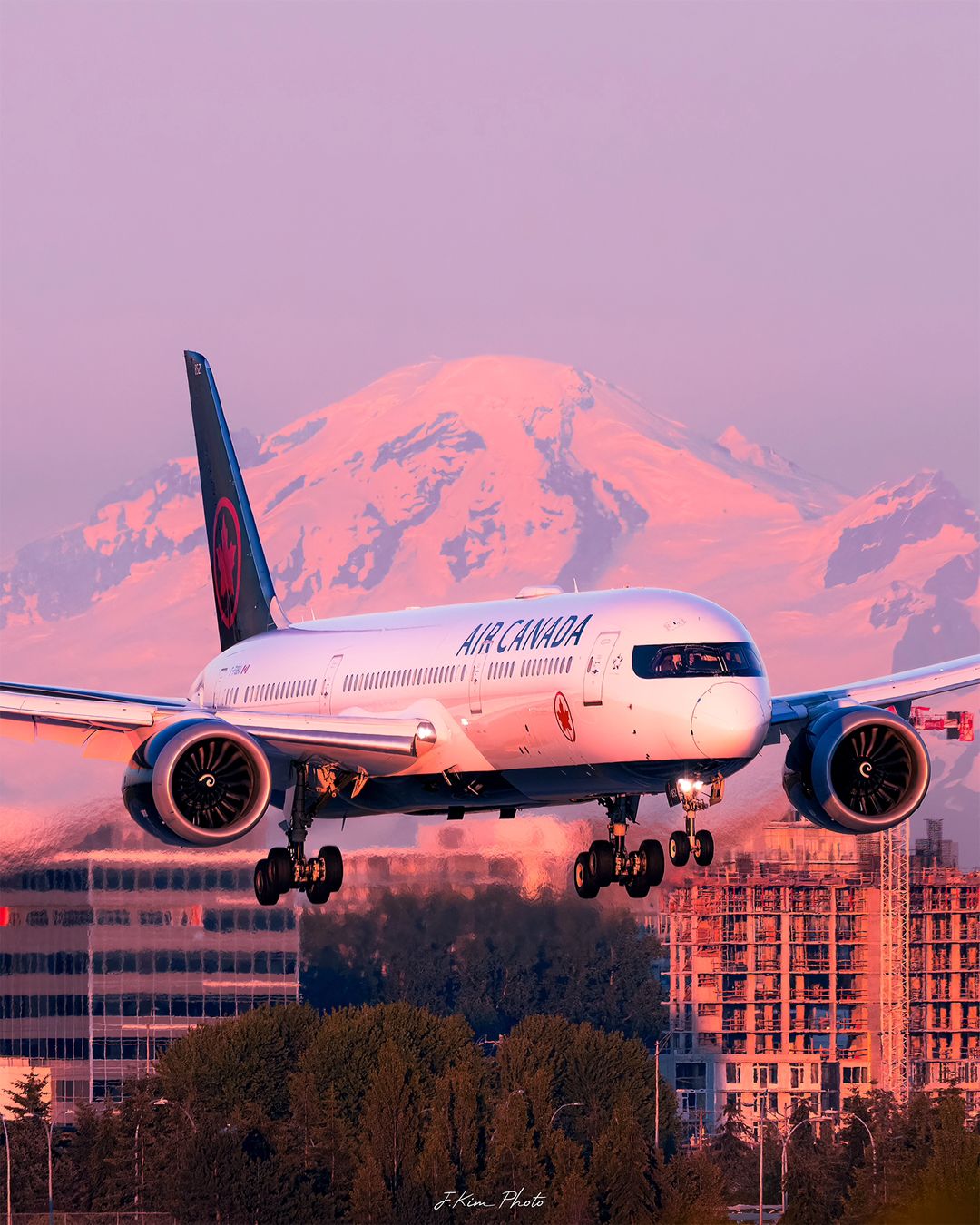 An Air Canada 787 Dreamliner at "pink hour" in Vancouver, B.C. Tagged on Instagram by @jakobkphoto