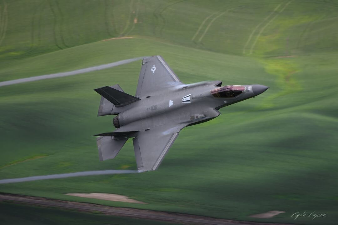 The F-35 Lightning II Demonstration Team flies over grassy terrain. Tagged on Instagram by @kylelopez