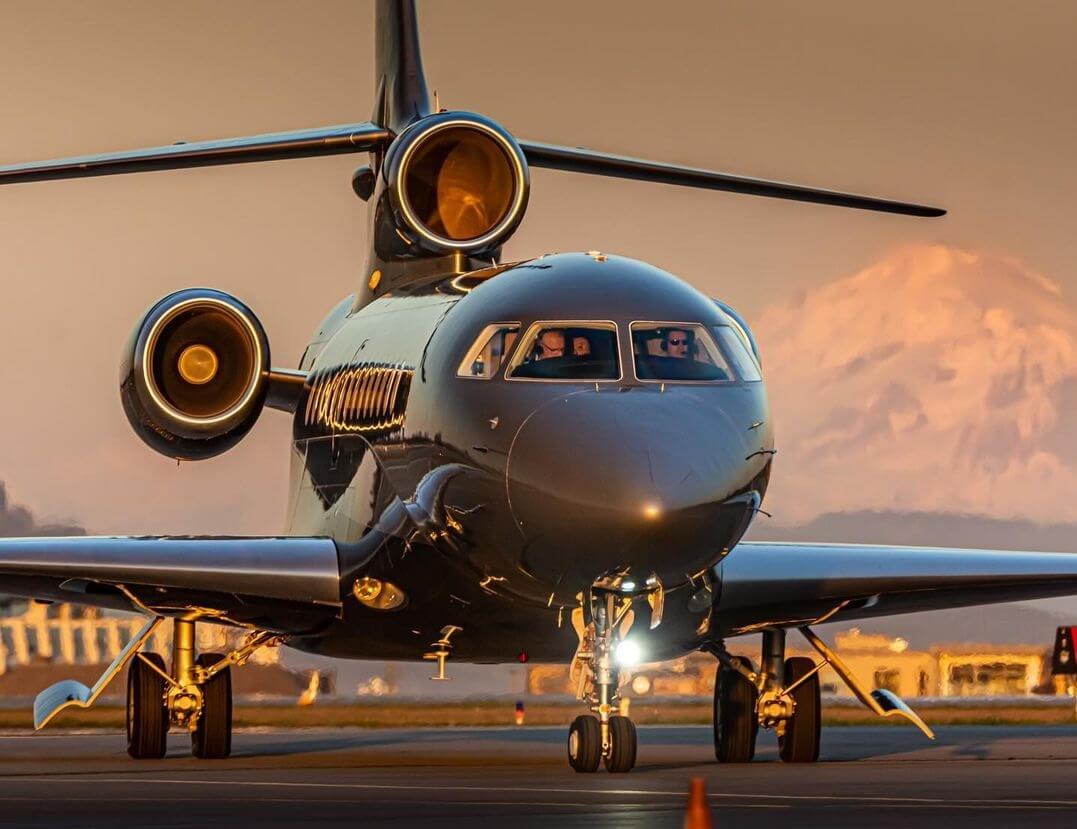 A sleek Dassault Falcon taxiing into the Shell apron at Victoria International Airport at sunset. Tagged on Instagram by @burtonader